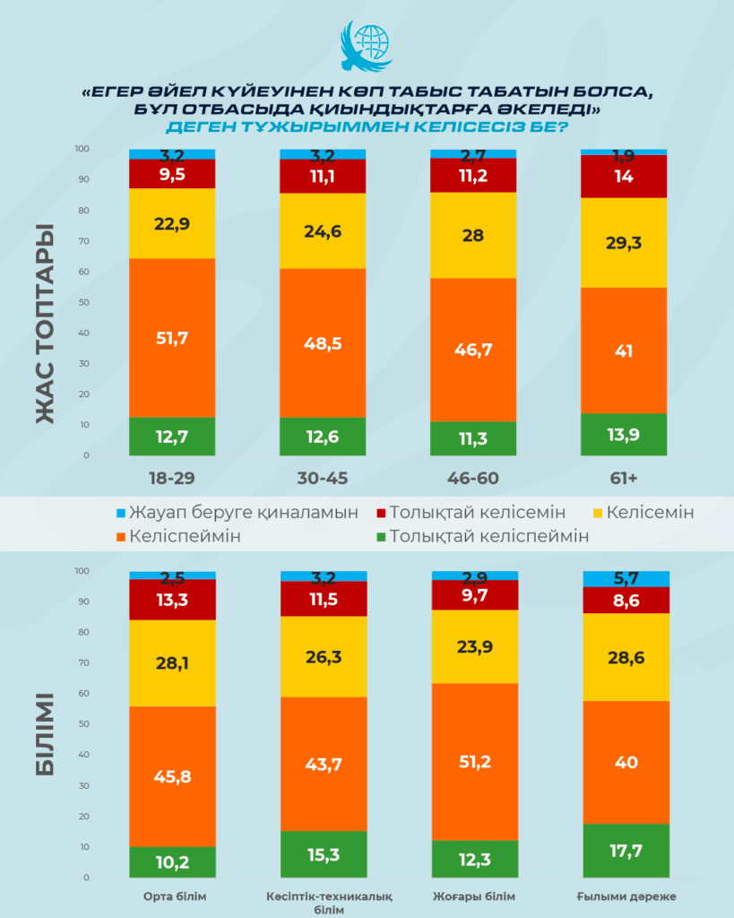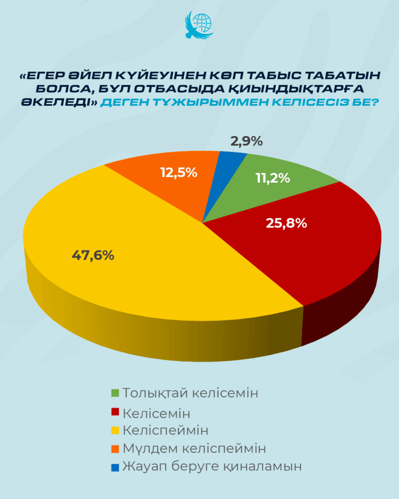 Сауалнама барысында респонденттерге мына пікірді бағалау ұсынылды: «Әйелдің күйеуінен көбірек табыс табуы отбасыда кикілжіңдер туғызады». Бұл сұрақ бір қарағанда жеңіл көрінеді, бірақ оның астарында қаншама сезім, үміт пен үрей жасырынған. Әдеттегі реттілік өзгеріп, үйде негізгі асыраушы әйел болғанда не болады?