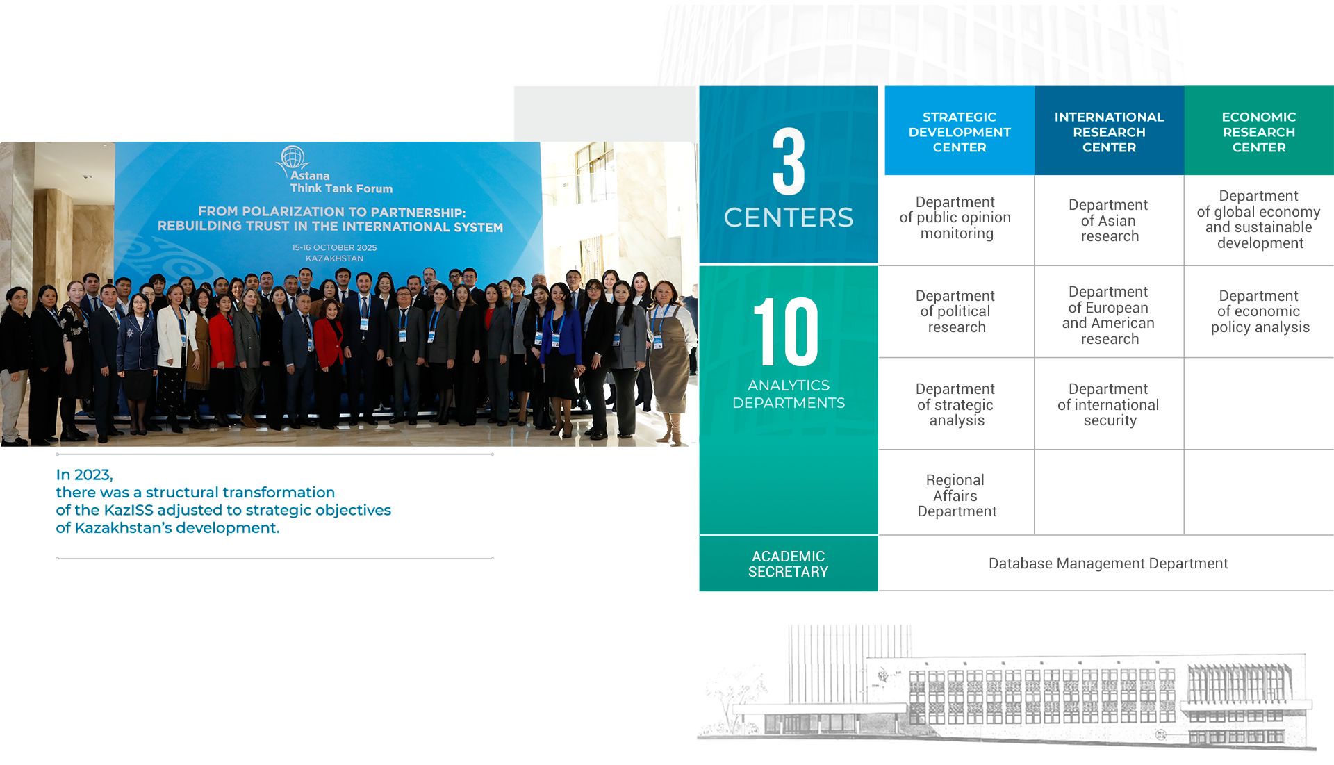- Since October 2019 – Research Fellow at the Department of Social and Political Studies, now Leading Expert of the Strategic Analysis Department, KazISS under the President of the Republic of Kazakhstan