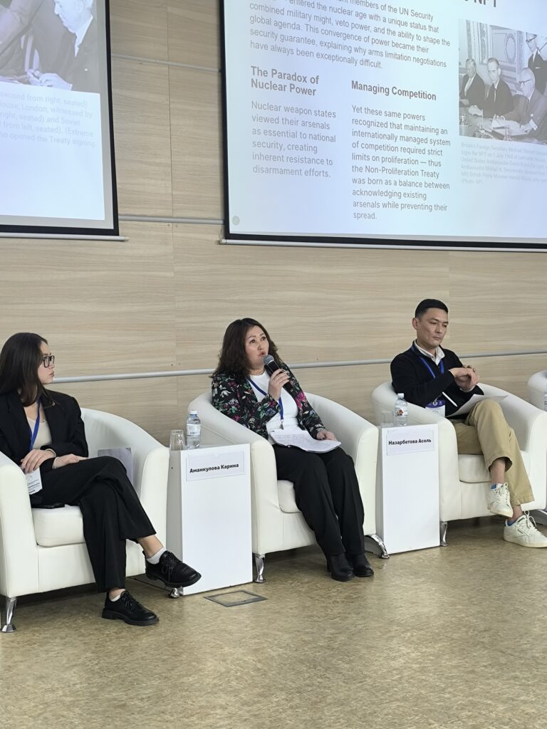 Конференцияның қорытынды бөлімінде Д. Әбеннің модерациясымен «Ядролық қаруды тыйым салу кампаниясы: жаһандық ядролық нөл мүмкін бе?» тақырыбында сараптамалық пікірталас өтті. Сарапшылар студенттердің белсенді қатысуымен ядролық қаруға қарсы халықаралық тыйымдардың тиімділігін, ядролық державалар арасындағы шиеленістің күшеюі жағдайында ЯҚТШ-ның болашағын, ядролық қарусыз әлемге қол жеткізу мүмкіндігін, сондай-ақ Орталық Азияның ядролық қарудан азат өңір моделі ретіндегі рөлін талқылады.