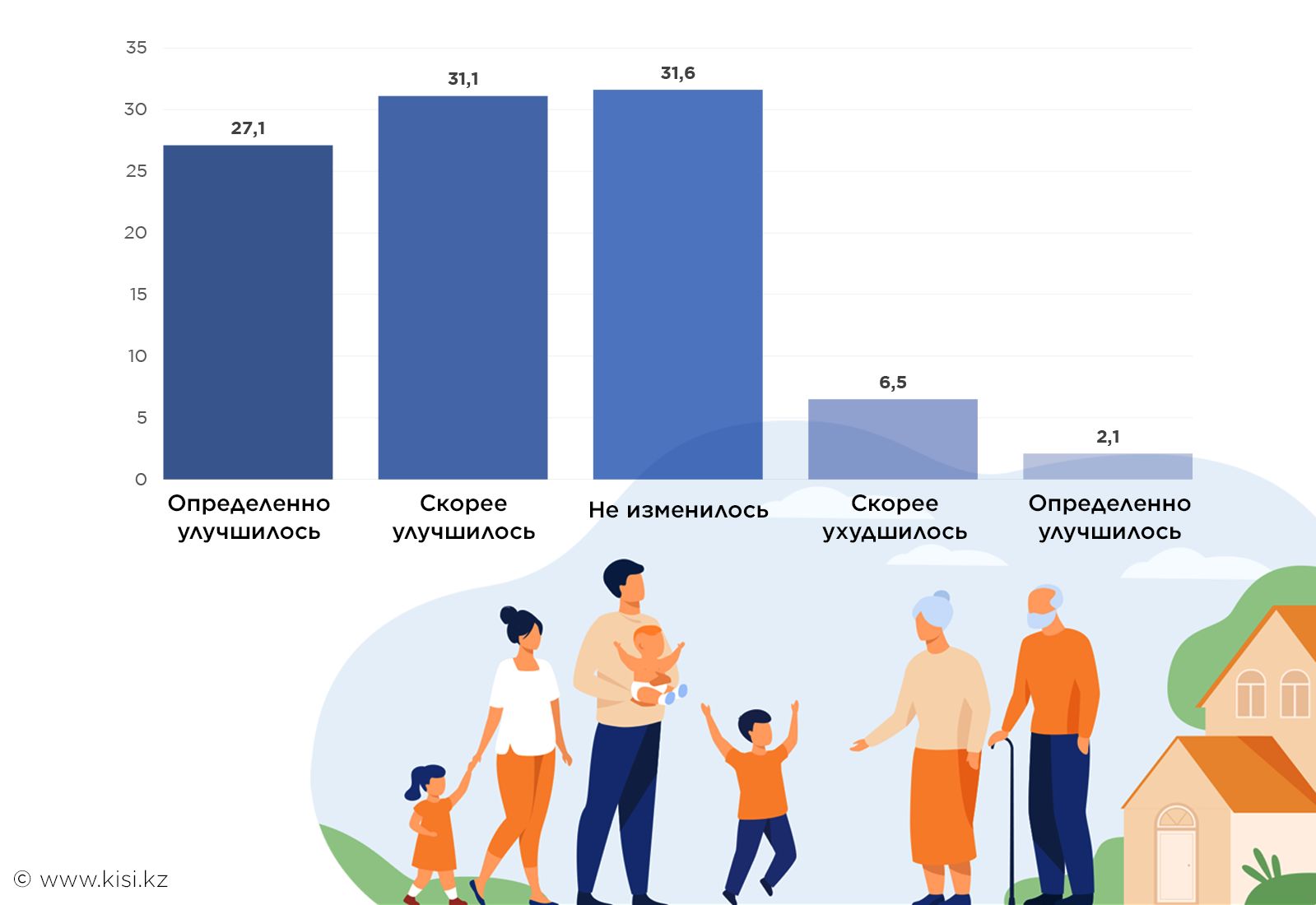 По данным исследования, социально-экономическое положение казахстанцев имеет тенденцию к улучшению, так, при ответе на вопрос «Как изменилось материальное положение Вашей семьи за последний год?» треть респондентов (31,1%) считает, что материальное положение его и его семьи скорее улучшилось, треть (31,6%) – что оно не изменилось, осталось прежним. Явный рост собственного благосостояния отметило 27,1% опрошенных. И только 8,6% респондентов посчитало, что их материальное положение в той или иной степени ухудшилось.